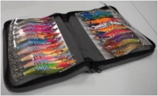 Egi lures are easily stored by hooking them in the foam mesh. The plastic cover protects the hooks from moving around and prevents the case from getting damaged.