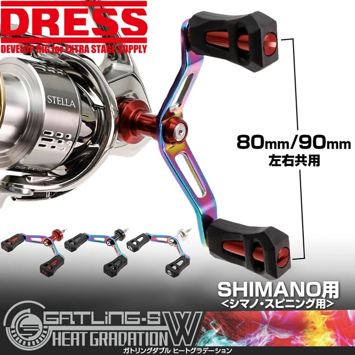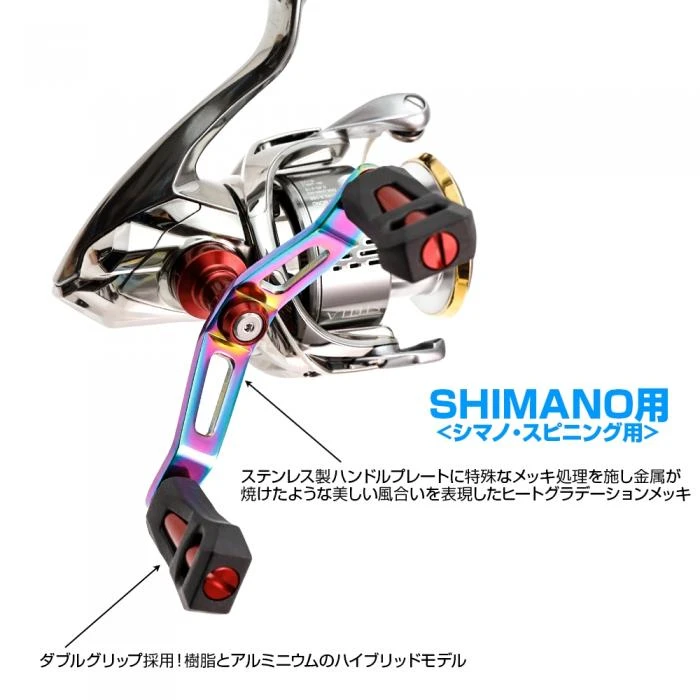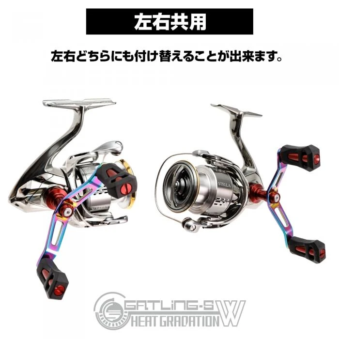 DRESS GATLING W Gatling Double Heat Gradation 90mm [SHIMANO] is a dedicated custom handle for Shimano spinning reels that can be mounted on both left and right side of reel. Made with “heat gradation” colour. The handle plate is a 3 mm thick molded rust resistant stainless steel and is a double handle equipped with a resin grip. This grip is a hybrid model of resin/ aluminum which reduces weight and has the same sensitivity as a metal grip although it is resin
