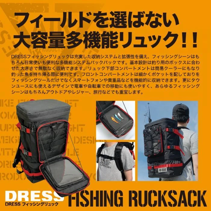 DRESS FISHING BACKPACK IS A MULTIFUNCTIONAL SYSTEM BACKPACK WITH A RICH STORAGE SYSTEM AND EXPANDABILITY, AS WELL AS FISHING SCENES AND EVERYDAY USE. THE BASIC DESIGN IS THE SIZE ACCORDING TO THE FISHING BOX AND CAN BE STORED WITHOUT WASTE. THE LOWER COMPARTMENT OF THE BACKPACK IS ALSO A SIMPLE COOLER AND CONVENIENT FOR BRINGING BACK THE FISH YOU CATCH. THE FRONT COMPARTMENT HAS A FINE POCKET THAT ALLOWS YOU TO STORE NOT ONLY PHISHING TOOLS BUT ALSO SMARTPHONES AND VALUABLES FUNCTIONALLY. IN ADDITION, IT IS EASY TO USE FOR TRAVELING BY TRAIN OR BICYCLE WITH A DESIGN THAT CAN BE USED FOR TOWN USE, AND IT IS USEFUL NOT ONLY IN ALL FISHING SCENES BUT ALSO OUTDOORS, LEISURE, TRAVEL, ETC.