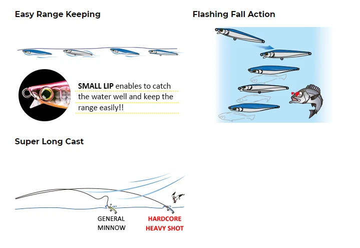 Made in Japan, this lure features a flash falling action, easy range keeping small lip that enables to catch the water well and keep the range easily.