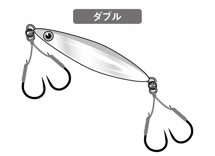A series of double assist hooks perfect for shore jigging and boat jigging. Matched with a stiff and strong assist Gamakatsu 480 type cord to prevent unnecessary tangles and optimises a secure hook up. Suitable for shorter jigs such as slow jigs.
