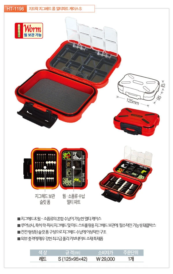 A multi purpose, super convenient jighead & soft plastic lure accessory tackle box. Featuring a foam system with series of lines to store jigheads for ease of use and convenience. A specialised tackle box to neatly store and carry around soft plastic lure accessories and jigheads with a rubber seal around the edges of the case to prevent water from entering from the sides of the box. Shockproof design for durability and prevents damages to the contents inside.Â