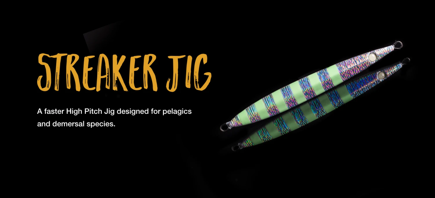 The Streaker jig is a high pitch jig designed to be worked faster. It is perfect for yellowfin, Bluefin, amberjack and a variety of other Species. It has gained huge popularity in the 80-120g sizes in the NE Coast area when trying to mimic a sand eel when jigging striped bass and bluefin tuna. The sizes available mean you can fish this in shallow water for grouper and snapper, through to deep water for yellowtail, amberjacks and tuna.