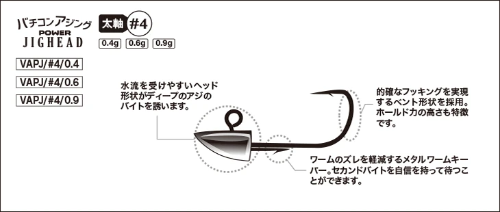 The collaboration of Japanese hook manufacturer Decoy and lure specialist company Palms has created a high-strength jig head specialising in vertical contact ajing aimed at large yellowtail commonly known as “Vaticon” in Japan. By adopting a wire that has high penetration performance and strength during the hook up, it is possible to fight with confidence even when a larger by-catch is hooked.Â