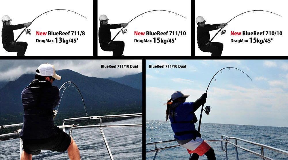 To stop GT that is swimming to the bottom of the sea while weighting on the rod, BLUE REEF series have been loaded more strength than BlueSniper series. Fulcrum point of bending curve have been set little farther than BlueSniper series so we recommend you to fight while shifting your own weight. Of course it will be worked well for king fish game that you are required to choose rod more than 6 power.Ā