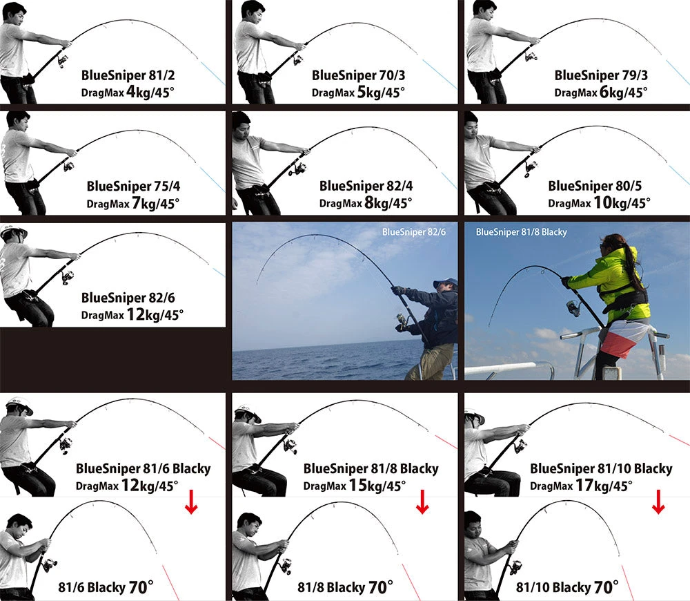 These are images that have been tighten the drug of reel maximum on the rod from boat casting series and keep it 45 degrees angle and Put a load to obliquely downward. Blacky series can be kept holding more than angle so we have added images that holding rod more than 70 degrees angle.Â